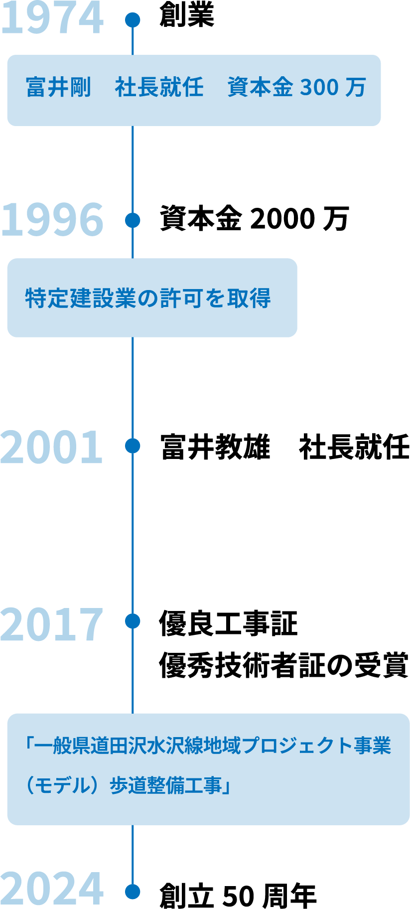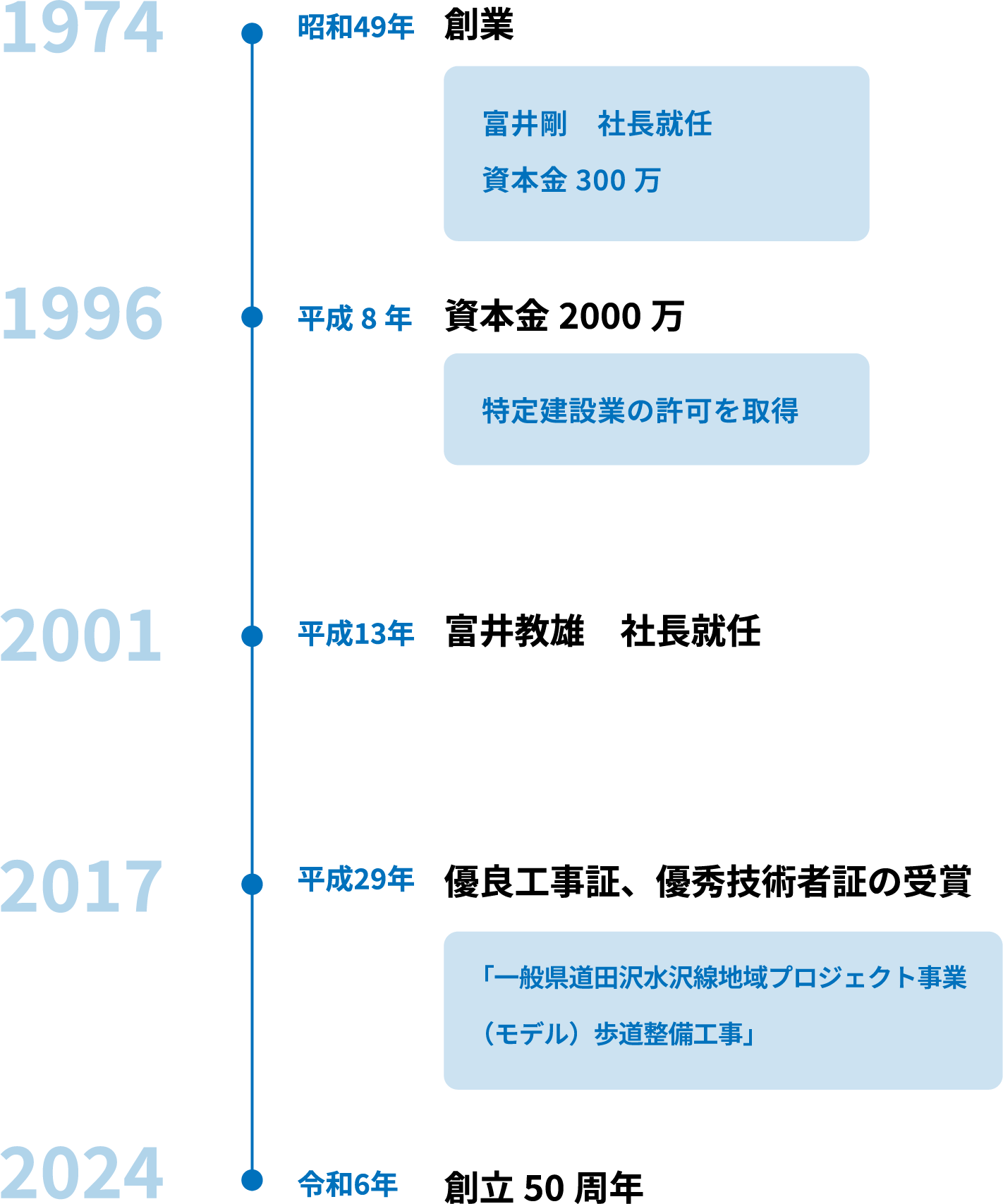 この間、 時代の変化とともに土木技術も大きく進化し、多様化するニーズに応えるべく常に技術・品質の向上に努め 、 地域の明るい豊かなまちづくりのために 真摯に取り組んでまいりました。